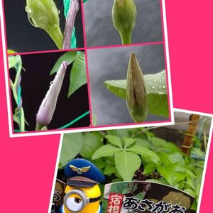 台風で支柱が倒れて😣 でも蕾たちは無事でした🤗 モミジ葉朝顔💠第一号の 蕾を見付けました❇️ 明朝咲くと思います😉➰💕