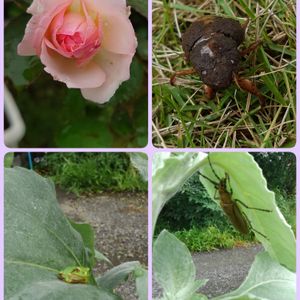 散歩で見掛けたアマガエルとカミキリムシ🐸🐛 セミの幼虫は車庫で見掛けて薔薇の枝に(ピエールドロンサール)置きました🤗
