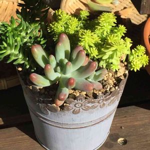 この前、多肉デビューした次男。多肉ちょうだいちょうだい言うから、取り敢えず名無しセダムあげました。これなら子供でも挿し木できるし、すぐ根付くし、すぐ増えるし楽しいかな?って。 そしたら長男も多肉ちょうだいちょうだい言うから、長男の使わなくなった鉢に名無しセダムと爪蓮華と子持ち蓮華も入れて植えてあげました😊 さて、どれが勝つのかな⁉️ ペットボトルジョーロ入れるとこ、鉢がピッタリ入ったからハメといた🤗 虹の玉とビアホップとブロンズ姫を増やし中だから待っててね👍🏻春にはあげられるかなぁ😁 それまでに飽きなきゃいいけどさ💦飽きても私が愛でるから大丈夫だけど😍