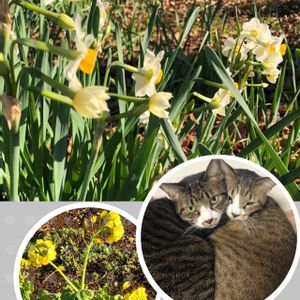 🌼水仙と菜の花と猫🐱 これから冬になるというのに、水仙と菜の花が元気に咲いてました😊 3〜4月に咲く水仙ですが、早いものは11月から咲く種類もあるそうです。 コタツのない我が家は、🎵ねこは二匹で丸くなる〜〜🎵