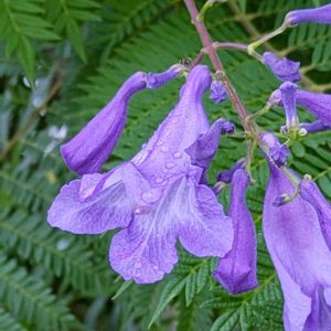 こんにちは😊 今日2枚目は昨日も咲いてた ジャカランダ🌿💜🌿 別名-キリモドキ、紫雲木(シウンボク)💜 その花姿がキリ(桐)の 花に似ていることから キリモドキの名前に🌿💜🌿 ノウゼンカズラ科キリモドキ属 熱帯アメリカ原産の落葉高木🌳 ①猛暑にも負けず雨にも負けず昨日も駅前で🌿💜🌿 ②背景のビルに映える🌿💜🌿 ③落花(長さ2.5~5㎝で曲がった筒状)を拾い帰宅💜 ④中を見てみました🔍️ 5本の雄しべバッチリ 残ってました💛🤍💛 5本の雄蕊の内の長い1本は先端に葯をつけず花糸に細毛が生えた仮雄蕊🤍 ⑤雌しべは胚珠と共 に木に残っています🌿🤍🌿 picの↑の細長く先端がクルンと2裂の白い子が残った雌蕊 🏷️金曜日の蕾たち 🏷️彩月(いろどりづき)の青い花2025 🏷️青い花マニア 昨日の駅前で💐2025.9.4