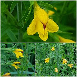 ヒキヨモギ ハマウツボ科ヒキヨモギ属 千島列島(南部)〜九州、中国 日当りのよい草原に生える 半寄生植物 🌿☘️は複雑に切れ込む 黄色の花の上唇の上部には毛が生える(ピンぼけだけどUPしたら)下の赤も不気味。