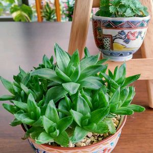 手前のハオルチアがモリモリと成長中 百円で買ったのが何倍にも😍奥の古伊万里のお猪口では謎のハーブを育成中(ヤバい物ではない)古伊万里の手書きの鳥が可愛い