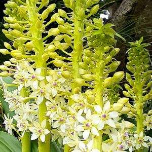 こんばんはー(^^) ✨ユーコミス・オータムナリス(パイナップルリリー)✨ 小さな星形の花が、下の方から次々と咲いてきました~!🌟🌟🌿