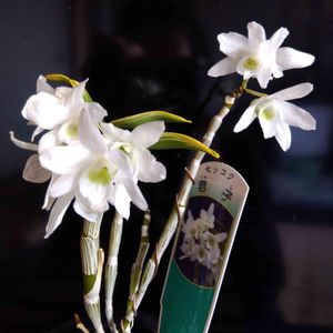 石斛が咲きました。君子という斑入りの品種です。 殆ど放ったらかし😆 申し訳ないくらい面倒見てません😂😂😂 それでも咲いてくれました😍 小さいのに丈夫なんですね😉🥹 今度は色違いで買ってこようかしら🪅