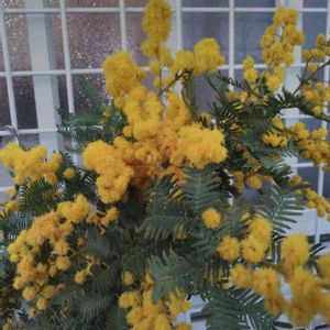 春の花ミモザの切り花が手に入りました 玄関脇の窓辺に飾って (*˘︶˘*).。.:*♡ 黄色は、見立ちますね😆💐