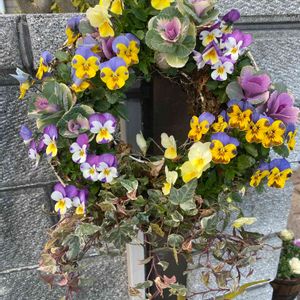 2020.12 葉牡丹とビオラのハンギングバスケット🤗 ・ ミニハボタンを周りに、中心にはビオラを入れて、吊り下げのハンギングバスケットを制作❣️ ・ ビオラがもっとこんもり綺麗に咲きますように😊
