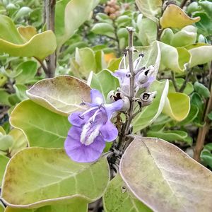 ハマゴウ(浜栲)シソ科ハマゴウ属 海辺の公園から浜に降りてみました。 ハマゴウの葉が紅葉してました。 紫のお花がまだ咲いてました。 5⃣ 少し前に行った時、ハマヒルガオとハマエンドウの葉を見つけたので、咲いてるかな〜と思いましたが、咲いてませんでした。 海岸の砂浜に生える小低木で、茎は長く横にはい、枝は直立または斜めに立って高さ30~60cmになる。 葉は対生して長さ3~5cm、幅2~3cm、表面は緑色で光沢はなく、裏面は細かい毛を密生して白色、葉や茎をもむと、強いにおいがする。 花は小枝の先端に10~20個つき、紫色で上下2唇に分かれ、下唇は大きくて3裂し、中央の裂片には内面に毛がある。 葉や樹皮、果実に精油分を含み、芳香があることから浜香(はまごう)名がついたとされる。 🏷 木曜日は木