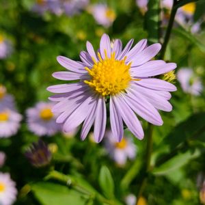 ユウゼンギク (友禅菊) 別名 メリケンコンギク 🌱キク科 シオン属 ✽茎はよく分枝して30〜70cmの多年草 ✽全体がほぼ無毛 ✽葉は細く線形状楕円形で全縁か低い鋸歯かあり、下部の葉に短い柄がある ✽筒状花群を囲む舌状花は20〜50個ある 優しい色合いで癒やされます💜