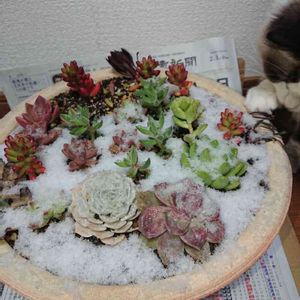 只今、帰宅⛄ 真っ先に庭の多肉を避難させました❄️ ネコちゃんが、イタズラ(笑)