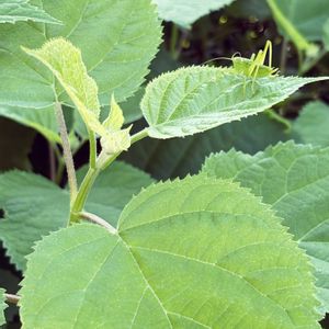 虫が苦手な方スミマセン🙇 アナベルの葉っぱの上に、キリギリス発見! その場で慌てて検索したところ、バッタとは違いキリギリスは益虫との事なので、記念写真を📸