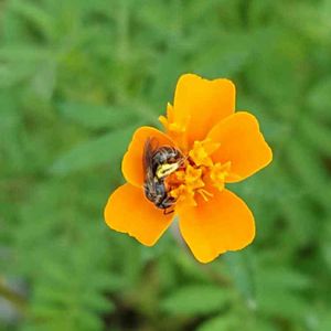 マリーゴールドにハチがきてくれました。花粉がちょっと重そう😅 近くにあるキンカンの受粉もしてくれてると思います🐝