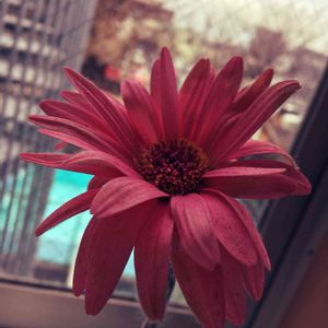 窓辺にて。 気持ち良さそうに開花のガーベラさん。