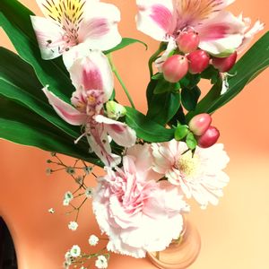 一輪挿し【美】💁🌺 ピンクのガーベラの花言葉 「崇高美、思いやり🌈🌈」 ピンクのガーベラには、 女性らしさを上げてくれてるお花だそぅで コロッと丸く、可愛いらしい一輪挿しに🌸☺️