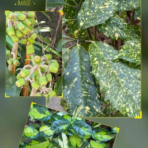 今日も夏の天気で暑い一日でした。 うちの庭の緑を集めました。 ツワブキの蕾、アオキ、ハツユキカズラ。