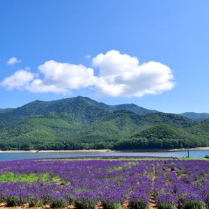 南富良野かなやま湖にて。 ラベンダー越しに山と湖が眺められる素敵な場所。