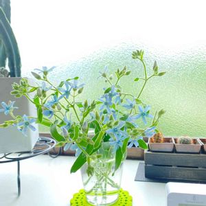只今、お昼のキッチン31℃☀️ 昨日の雨で、うな垂れてたブルースターをコンビニカップに挿しました 何だかこの感じラララ気分♪♪〜..。☆.。☆*゚
