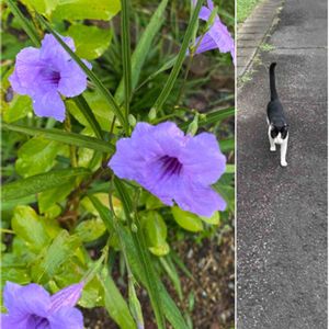 今朝の一コマ✶.•*¨¨*•.✦ 昨日まで蕾だったのが今朝、一気に花開いてました✴︎✴︎ 綺麗な紫色です🎶 早朝、散歩途中でジジとバッタリ(⊙⊙)!! 「早朝パト? それとも朝帰り⁈」 確かに昨晩は見かけなかったなぁ… ニャ~ニャ~鳴いて🐾バイバイってすれ違いです◡̈⃝‧₊ 私が帰ると長々〜と玄関で寝てました(^^)
