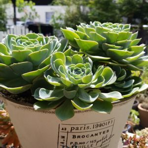 おはようございます☀️ 緑色の葉が横に育ち、丸い形がバラのよう 一回り大きな鉢に植えたのに小株も成長して窮屈そう