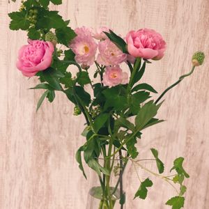 お稽古 自由花 ピンクの花器を使用して ヒペリカム、芍薬との同調効果を狙いました😊 芍薬の蕾ぐあいがベストです! 房すぐり 初めて使いましたが 実が(海ブドウみたいで)なんとも可愛いのです💕