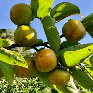青空と柿〜。 我が家に3本ある柿。次郎柿と禅師丸柿と、この西村早生柿。8年程前に追加で植え、3年前から収穫開始、極早生品種で早ければ9月下旬に熟します^_^。