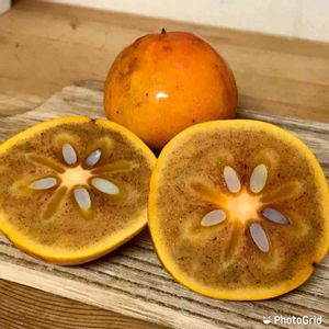極早生品種の西村早生柿を試し採り〜😊、これもやっぱり「パカっ!」🔪とな。 まだ少し早いが、種5つあり、ごまがちゃんと入ってなかなかの断面👍、既に結構甘い🤤。 あと10日もすればいいんじゃない?🤔。
