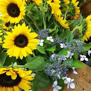 ヒマワリの迫力に アジサイが負けてる… ここしか場所ないから ミスマッチだけど 許してね😂