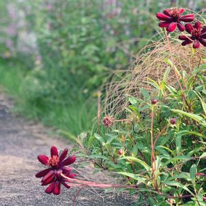 チョコレートコスモス シックで素敵な色のチョカモカが咲きました♪ たくさんつぼみがあるから、この先まだ咲いてくれると思うとワクワクです。