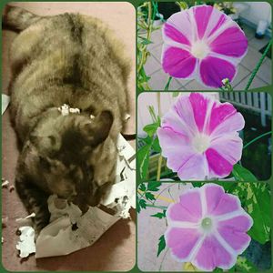 今朝の朝顔サンです😍 ↗➡はプランター1号サン、絞りっぽくて😆⤴💓 ↘はプランター2号サン、可愛く咲いていました😍 ⬅サクラ😾は紙を噛みちぎり遊んでいました😁散らかすので困ります😂 9/22みちのすけさんの「ニャンニャン祭り」のタグつけさせて下さいね🙏