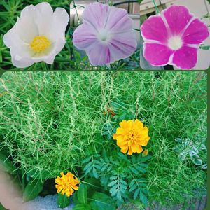 おはようございます👋😃☁ ⬇昨日とは又違うコキアサンの隙間から顔を出すマリーゴールドサンです😍何かカワイー😍 ↖松葉牡丹サンは1日でしぼんでしまうので、寂しいです😖せめて3日位咲いていて欲しいです😊 ⬆↗は昨日のプランター1号の朝顔サン😊 又々picしたくなりました😄