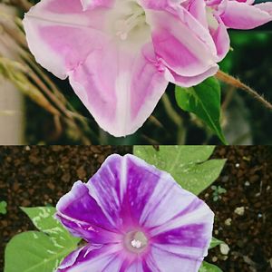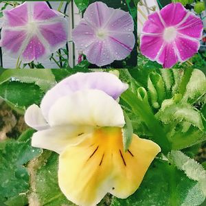 ⬇は春の零れ種のビオラサンです😍 虫にかじられていましたが暑い中、可愛いお花を咲かせてくれていました😍 昨夜の雷雨でびしょびしょになりながらも、今朝咲いていた朝顔サンです😍 ↖はお母さん朝顔のDNAを受け継いでいる地植えの朝顔サンです😍 ⬆↗は少しひねくれたプランター1号の朝顔サンです😍昨日の朝顔サンと同じような色彩で咲きました😍 ↗の子は何故か6つに別れていました😊昨日は5つなのにフシギ👀‼