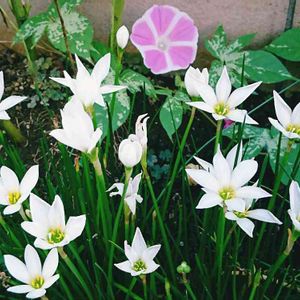 おはようございます👋😃☀ ゼフィランサスサンが沢山咲きました😆⤴💓 零れ種地植え2号の朝顔サンが咲いていたので一緒にパシャ👀📷✨