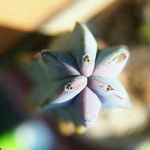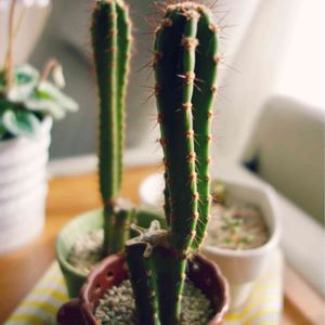 柱サボテンで、うちのサボテンの中では最も背が高いです。購入してから6年目くらいになります。 当時は、わきからでている子株くらいのサイズでした。
