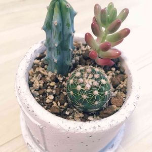 こんばんは★ 昨日、初めて作った多肉の寄せ植えです😍 小さな苗を、真っ直ぐ立てて植えるのが割と難しい💦 そちらに気を取られて、鉢の柄と並べ方のバランスがおろそかに!柄を正面にすると、背の低いサボテンが隠れてしまいました😂 まぁ、最初なので元気に育てば良しとしましょう!笑 左のリュウジンボクは、サカタのタネで、右のセダム属と、手前のサボテンはダイソーで購入したのですが、正式な名前がわかりません。 もしわかる方がいらっしゃいましたら、教えて頂けるとありがたいです😊