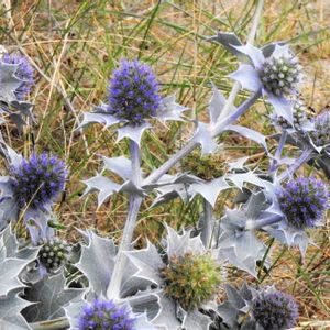 学名 Eryngium maritimum 仏名 panicaut maritime 海辺の 乾燥した 所に生えています 青白くトゲのある丸形の人工物のような葉がとても魅力的なエリンジウムです フランスでは保護植物 です