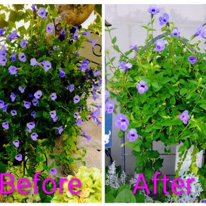 ハンキングの切戻し🌿 PWスーパートレニアブルーリバーがモリモリ過ぎなので台風が来る前にバッサリ切り戻しました✂️ 一回り小さくなりスッキリコンパクトにしました☺️🌿