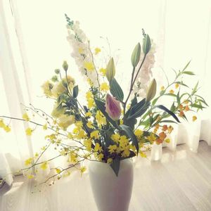 二週間くらいもってて長持ちしてる 今日陽に当てて花葉に霧吹きしたらもっと生き生きしてきてだんだん愛着が。 旦那さんが買ってきたから名前がわからないけど… 花瓶も洗ったから、より水が透明で涼しげな空間をつくってくれてる