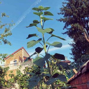 うちは毎年ジャイアント向日葵。 今年は良く伸びました。2m半くらいありそう、、 咲くのが待ちきれず載せちゃいます(>_<)、 ちなみに両端の家と木はお隣です。