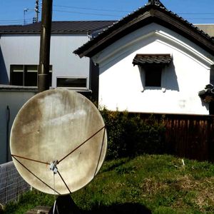散策中に、通り道のお宅の敷地内に、蔵と大きなパラボラアンテナが、有りました。パラボラアンテナに繋がる電線を見ると、2軒のお宅へ繋がっていました。