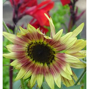 おはようございます 今日のお花 ヒマワリ 赤いカンナと 散歩道で 7月19日
