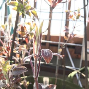 クレマチス・花炎 まだ口は固いか⁉️ うーん🤔 まだまだかな❓ 🌿の色は茶色から緑に、普通になってきた。