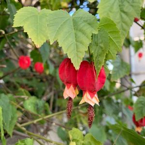 おはようございます✨ 寒空の下、たくさんの葉っぱの中から 小さな赤いお花さん達が元気に咲いていました✨🎶 思わず自転車🚲止めて、またまたパシャリです😄 葉っぱがどことなく、ハート型に見えてかわいい✨💞 アブチロンのお花 別名 チロリアンランプ ウキツリボク(和名) 原産地 ブラジル チロリアンランプといっていましたが園芸においての名前だそうです❣️ 赤く見えている部分は赤い❤️筒状の萼 その下からのぞいている 鮮やかな黄色がお花🌼 薄茶色のとびだしているのは雄蕊、雌蕊 春から夏にかけてとありますが。比較的温暖な地域差では一年通して楽しめるお花だそうです。 又低温、積雪の地域では鉢植えにして室内で楽しむと良いと案内されていました❣️ Wikipedia参考