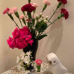 アレンジで余ったカーネーションのお花とプランターに咲いたお花(ZERA IIフクシアと白いレウシア)を生けてみました❣️ 最近我が家にやってきたフクロウさんも一緒です💕
