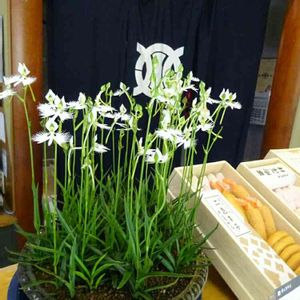 きょうのお花 サギソウ 鎌倉駅前店 この蒲鉾店に毎年飾られる サギソウの鉢は圧巻 専門の方に依頼し、 今日来たばかりと店員さん 8月5日