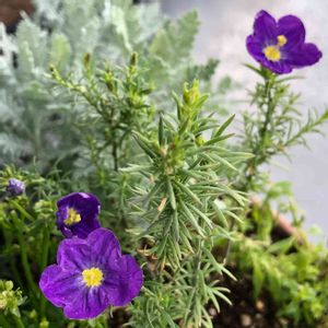 コンボルブルス クネオルム♪ ヒルガオ科の優しい花びら✨✨🥰 暗くなると閉じてお休みします🌠 今日は雨☔️風も強いので玄関に避難しました。 いつかブルー系にも巡り会えます様に💕