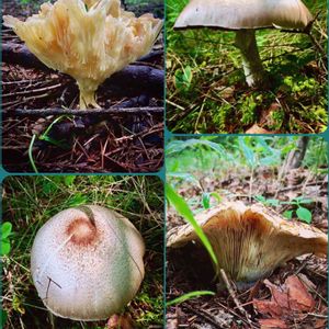大きなキノコ(名前不明) 諏訪郡富士見町の森の中、ハナイグチを探しに出かけるも、さっぱり見つからず…💦 変わったキノコを写しておりました😅 左下と右上は同じキノコです。どれもソフトボールくらいの大きさです😊 以上、本日はキノコのコラージュで3投いたしました。