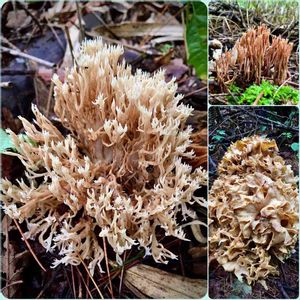 ホウキタケのなかまとハナビラタケ(?) 種類も、食べられるかどうかも不明💦💦 左:ハナホウキタケ⁇ 30cm程度の株です 右上:ホウキタケのなかま⁇ 右下:ハナビラタケ⁇ 30cm以上の大きさです😅