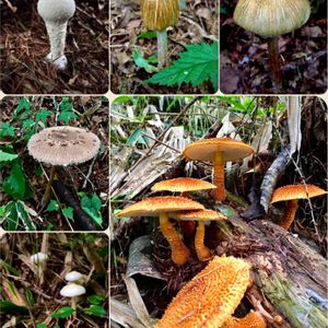 キノコのコラージュ おはようございます😃 キノコはいろんな色形があり、面白いですね‼️😊 名前は殆どわかりません!💦 左上がオニシロタケで、その下がカラカサタケかなぁ⁈右下がハナガサタケ😊 かなりいろんなキノコを撮ってみましたが、キリが無いのでこの辺で一旦やめておきますね! 明日はお花か蝶々でいきます‼️😄