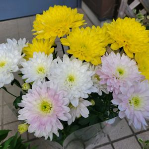 本日2枚目失礼します😅 さっき投稿したマムの黄色も あったのに、編集しそびれました💦 ①全体のポットマム ②載せそびれた黄色い子 ③パールアカシア 花芽が沢山出来たので、春が楽しみです😍