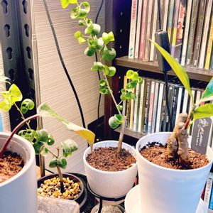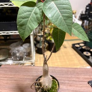 先日、フィカスの塊根植物ペティオラリスをお迎えしましたが、より塊根の発育が良いとされてるパルメリーも相方としてポチってお迎え🪴 フィカス特有の気根めいた根も出てます ただ、土がコケまみれだし根詰まり気味な気味気がするので早く植え替えたい…😅